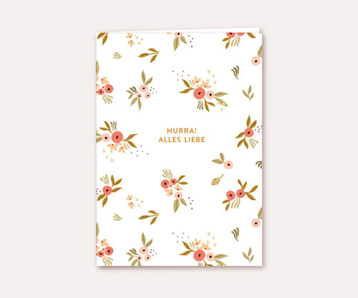 Liebevoll per Hand illustrierte Klappkarte "Hurra! - Rosalie". Blumige Glückwünsche in zartem Rosé und Apricot und warmen Grüntönen.