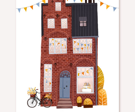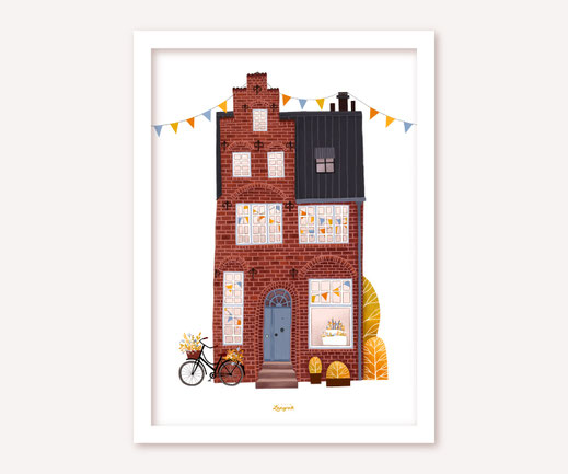 Liebevoll illustriertes Poster "Backsteinhaus".