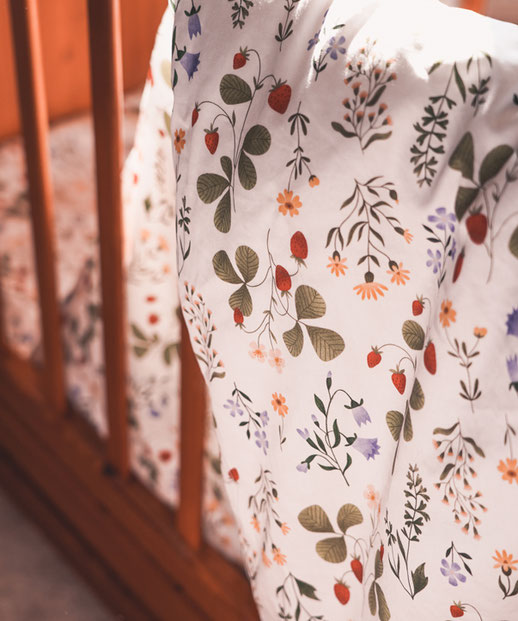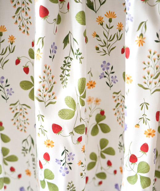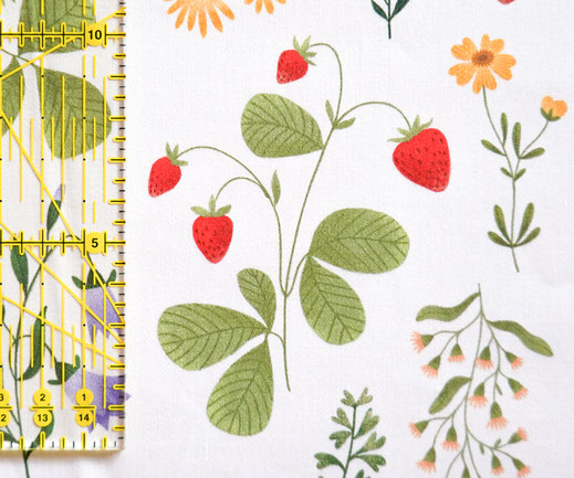 Bio-Baumwollstoff mit Satinbindung im floralen Design "Erdbeerwiese".